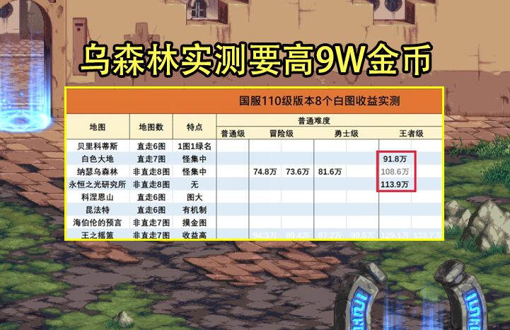 而在这2张图地图中,通过搬砖大神面码实测发现,乌森林收益更高的一些,虽然要比白色大地多一张图,但是却高9W收益。最重要的是,这还是普通难度的王者级,如果按照冒险~王者级金币的递增,那么英豪普通级至少也能拿120W左右。