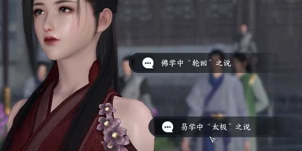 2、我们和谢鸳进行对话,对话结束后我们就可以开始选题了,第一题我们选择【李渤、李涉】第二个选择【修身齐家平天下】电梯我们选【天行有常】第四题我们选择【太极】;
