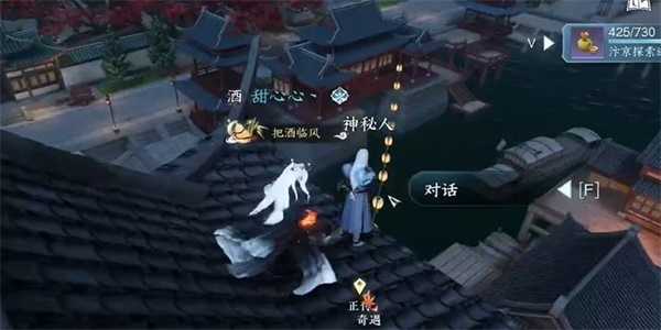 2、接着我们就来到【944,1038】到达楼顶,与神秘人对话,在对话途中我们需要接受挑战采花灯。