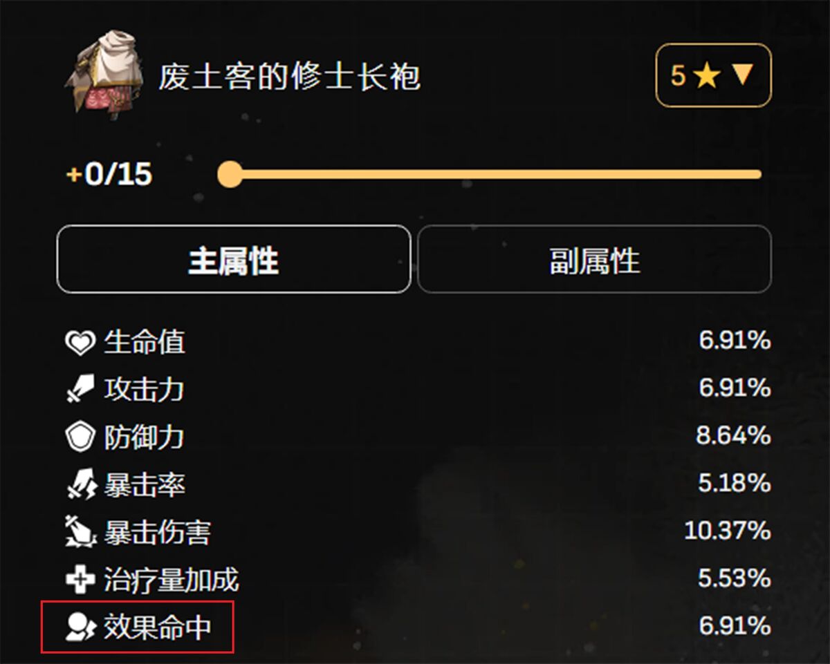 前期必堆命中,后期靠副词条把效果命中堆高后,偏输出定位可以把披风换成攻击加成或者暴击偏辅助。