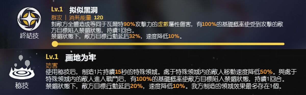终结技是AOE伤害+禁锢易伤,秘技在开战前制造一片领域,在领域内开战也能造成“禁锢”状态,陷入禁锢的敌人同样有10%减速效果。