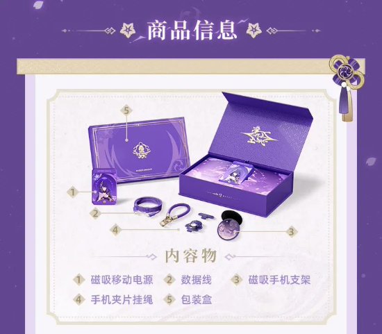 礼盒内含有5000mAh磁吸式移动电源、1米长CtoC 3A数据线、磁吸式手机支架、手机夹片挂绳和包装盒。
