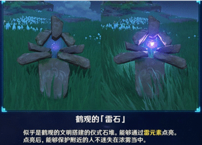 2、玩家需要在鹤观中大剑仪式石堆,需要用到雷元素,将这些东西点亮,而且雷石是可以在迷雾中帮助我们探索道路,也不会受到雾气的影响;