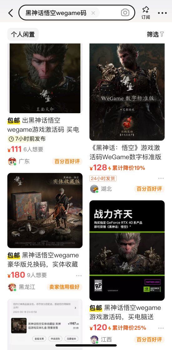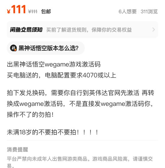 《黑神话》价格"崩"了?闲鱼WeGame兑换码仅售一百多元