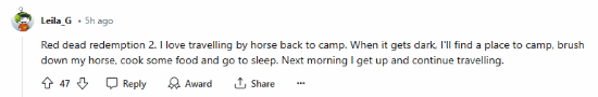 近日,有玩家在Reddit论坛发起讨论:哪些游戏能够让你不想使用快速旅行功能?在评论区里,玩家们纷纷进行了回应。有玩家以《荒野大镖客:救赎2》为例,表示自己喜欢骑马回到营地,当天黑的时候,就会找个地方扎营,给马梳理一下,做一些吃的,然后睡觉。在游戏的第二天早上,继续探索西部世界。