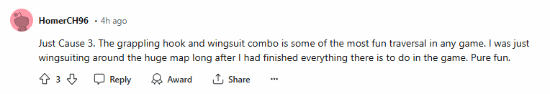 也有玩家以《正当防卫3》为例,表示游戏里的抓钩和翼装是非常有趣的道具,当完成游戏里的任务后,用这两项道具探索游戏世界也是很不错的选择。
