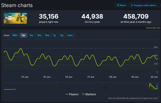 根据数据统计网站SteamDB里的信息显示,《地狱潜者2》玩家的最高峰值为458709人,但当前的玩家峰值仅为44938人,同比减少90%。有外媒表示,《地狱潜者2》玩家数量骤减的原因可能是与索尼强制让游戏绑定PSN有关。