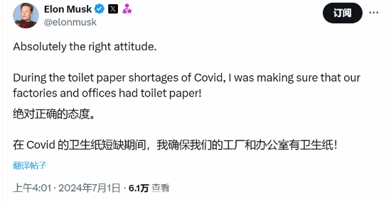马斯克在X上写道:“绝对正确的态度。在疫情时期的厕纸短缺期间,我确保我们的工厂和办公室有足够的厕纸。”