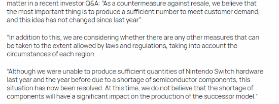 他补充说:“虽然去年和前年由于芯片元件短缺,我们无法生产足够数量的Switch,但硬件短缺的问题基本上已经得到解决,我们认为这不会对后续机型的生产造成重大影响。”