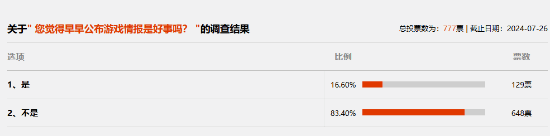 同时在上周Mark Darrah发表3A游戏公布过早的新闻投票中,共有777位游民老哥投票,其中有83.40%的老哥认为早早公布游戏情报不是好事,而在这篇新闻底下的评论中,也有不少老哥表示,过早的公布游戏太消耗玩家的热情。