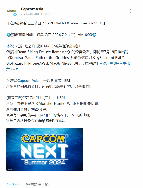 卡普空将在北京时间7月2日6点举行“CAPCOM NEXT-Summer2024”活动,本次活动将带来7月19日发售的《祇:女神之路》最新情报、《丧尸围城:豪华复刻版》和《生化危机7》iPhone/iPad/Mac版的相关信息,著名声优子安武人担任解说。