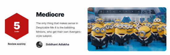 由照明娱乐打造的《神偷奶爸4》即将于7月3日在北美上映,IGN为《神偷奶爸4》打出了5分评价。