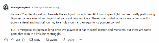近日有玩家在Reddit论坛发起了一次询问,询问的内容为:有哪些可以抚平悲伤并治愈人心的游戏?