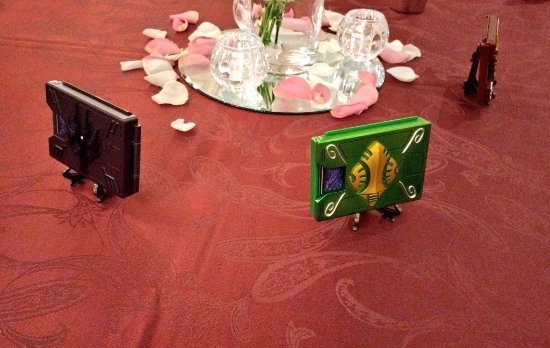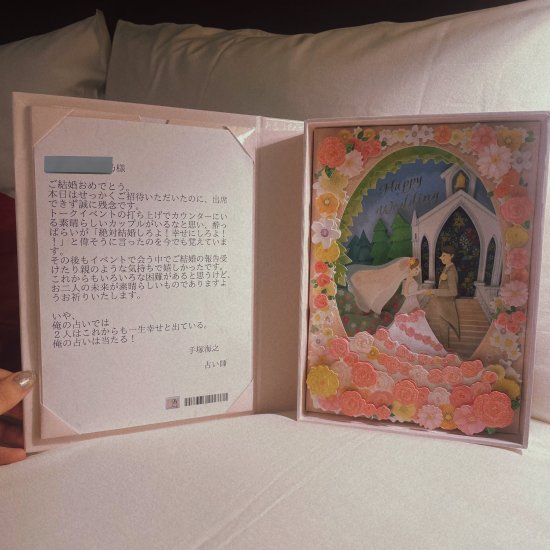 可以看到,每一桌宴客桌的上面都有很多个变身卡盒,迎宾桌上还摆上推主收藏的一些可动模型作为装饰物,连蛋糕都有着特殊的摆设。除此之外,饰演假面骑士海鳐的变身者——手冢海之的演员也发来贺电,还附上了卡片。