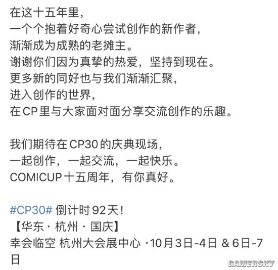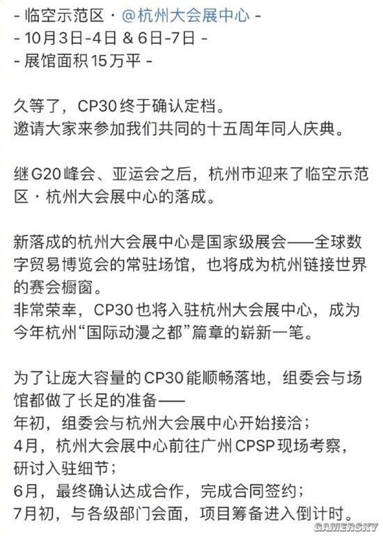 去年反复被骂上热搜的CP30,终于确认定档。离开魔都落户杭州,入驻杭州大会展中心。10月3日—4日 & 6日-7日 为期四天,分为两期。