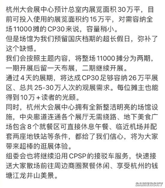 新选址杭州大会展中心预计总室内展览面积30万平,目前可投入使用的展览面积约15万平,对需容纳全场11000摊的CP30来说,容量稍小。
