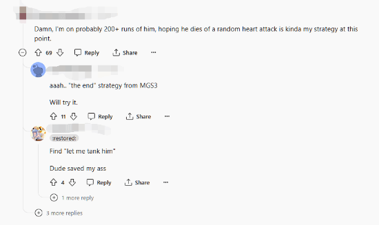 虽然Gneurshk__因为自己失去了跟BOSS战斗的机会而感到不满,但评论区还是有不少人都表示了自己的羡慕。“兄弟,我无法告诉你我有多希望这发生在我身上!”“该死的,我已经打了200多次了,期待他像这样死于‘心脏病突发’就是我现在的策略。”