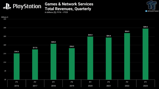 Tweaktown报道,据索尼最新的游戏和网络服务年度报告,其23财年(2023 年4月1日——2024 年3月31日)总营收为296亿美元,是收入最高的单一游戏平台之一。