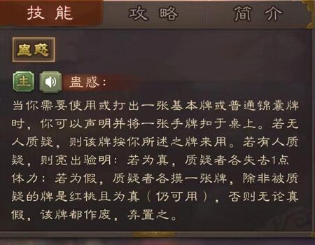 1、蛊惑:当玩家使用于吉时,且在自己的回合内,可反扣一张牌于桌面让大家去猜测,该牌可以时基本牌或者是普通锦囊牌,并且对此牌做出声明,声明可真可假,然后重点来了:A:无人质疑:如若无人质疑该牌的真假性,那么就按照你声明的牌型打出,如果有人质疑的话就需要验明正身了。B:如果验明后该牌为假,则质疑的玩家摸一张牌,如验明后该牌为真的话,质疑的玩家就会掉1点体力。
