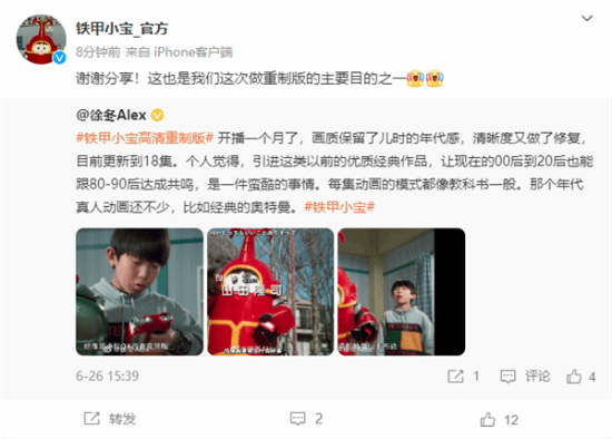 对此,铁甲小宝官方转发表示:“这也是我们这次做重制版的主要目的之一。”