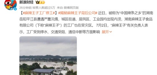 据新浪财经报道,近日,被称为“中国辣条之乡”的湖南岳阳平江县遭遇严重汛情,城区街道、居民区、工业园均出现内涝,湖南麻辣王子食品有限公司(下称“麻辣王子”)的工厂也在受灾区。