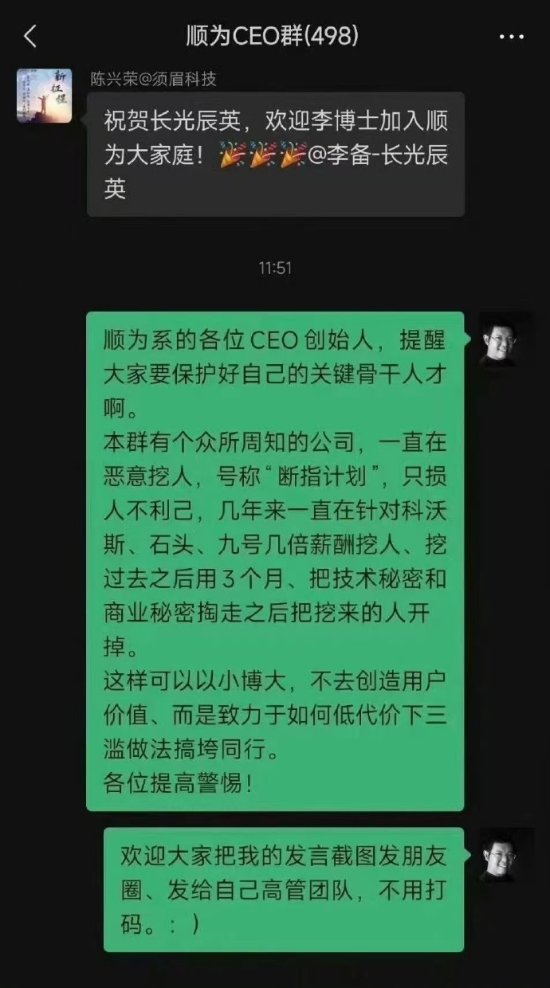 截图中,该群有人表示:提醒顺为系的各位 CEO 创始人,提醒大家要保护好自己的关键骨干人才。本群有个众所周知的公司,一直在恶意挖人,号称“断指计划”,只损人不利己,几年来一直在针对科沃斯、石头、九号几倍薪酬挖人、挖过去之后用了个月、把技术秘密和商业秘密掏走之后把挖来的人开掉。