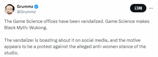 据游戏推主Grummz消息,近日,有人在《黑神话:悟空》开发商游戏科学深圳公司门口恶意涂鸦破坏。该人还在社交媒体上大肆宣扬此事,其动机似乎是为了抗议游戏科学此前被曝出的工作室内部歧视女性的传言。