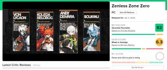 《绝区零》M站均分涨至82!玩家评分为6.3分