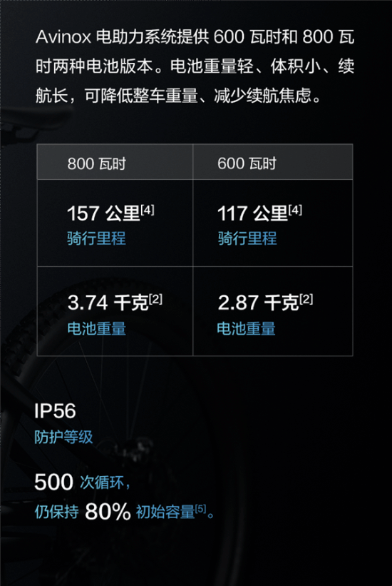 续航方面,Avinox 电助力系统提供 600Wh 和 800Wh 两种电池版本,标称续航分别可达 117 公里和 157 公里。
