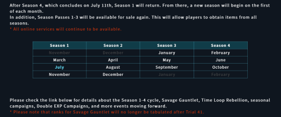 公告称,7月11日第四赛季结束后,第一赛季将会回归。此后,每个月的1日更换赛季,循环往复。除了限定活动外,每个赛季的通行证也会回归,方便玩家收集所有物品。