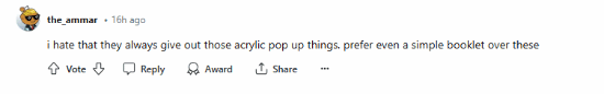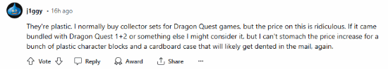 “我通常会为《勇者斗恶龙》游戏购买典藏版,但这次的价格太荒谬了,如果它与《勇者斗恶龙1+2》或者其他的东西捆绑在一起售卖,那我有可能会考虑它,而且我也无法忍受一堆亚克力块和一个典藏外箱的价格,这些东西可能会在运输的同时被损坏。”