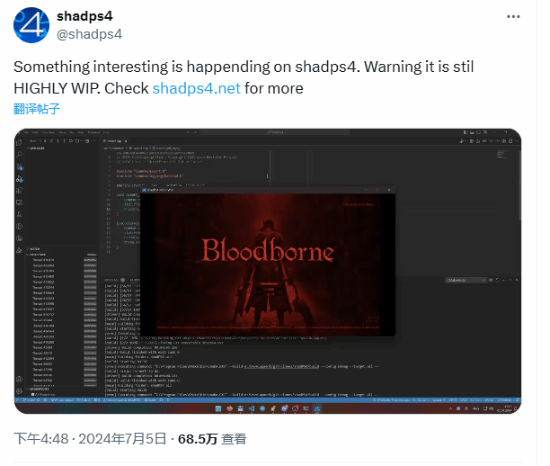 ShadPS4的开发人员表示,ShadPS4是第一个成功启动《血源》并能够进入到标题与设置菜单的PS4模拟器。从视频里可以看到,尽管可以进入标题界面,但模拟器仍存在显示问题,标题界面为红色,且不能直接进入到游戏内容里。