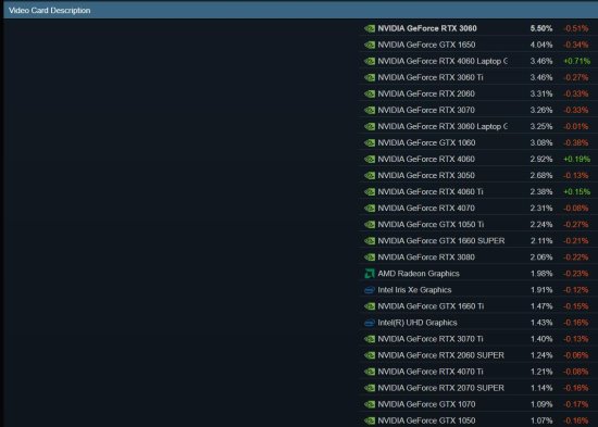 另外值得一提的是,在Steam用户的显卡选择方面,尽管比例下降0.51%,但RTX3060仍占比最高为5.50%,而RTX 4060 Laptop GPU占比增长了0.71%,达到了3.46%,和RTX 3060 Ti并列第三。