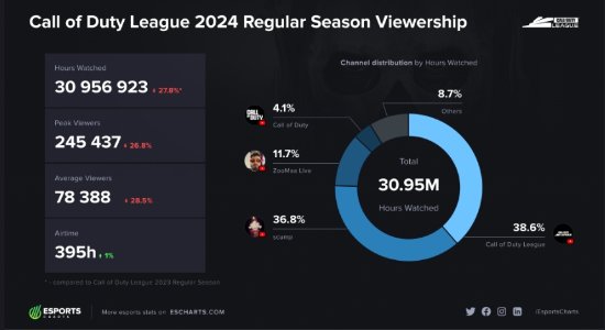 具体来看,CDL的平均观众人数下降了28.5%,峰值观众人数则下降了26.8%,同时比赛的总播放时间却几乎保持不变。