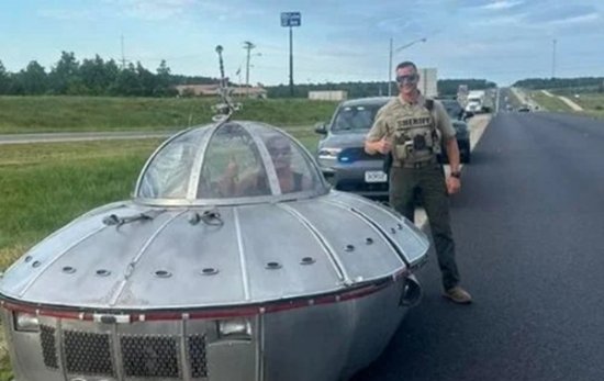 密苏里州克劳福德县警长办公室表示,警员们在该县州际公路上拦下了一辆飞碟形状的机动车。这辆车本来要前往新墨西哥州罗斯威尔市参加活动,那里因外星人阴谋论而闻名全美。