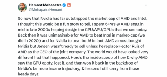 日前,Hemant Mohapatra 发布多条推文,表示在 21 世纪初期,AMD 公司差点就收购了英伟达公司。