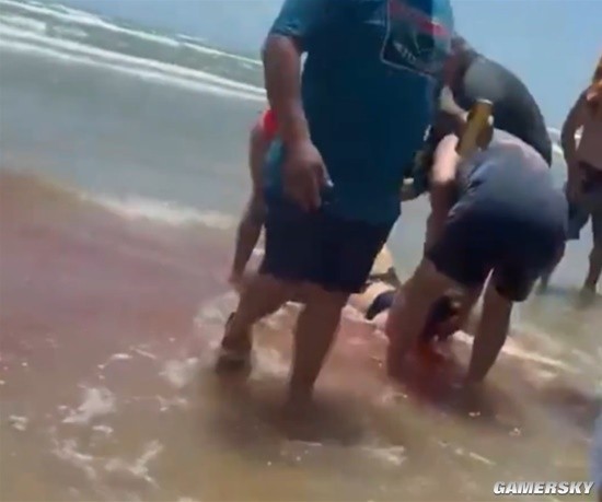 此次发生在美国得克萨斯州南帕德里岛海滩,两男两女遭到鲨鱼袭击,据目击者称,其中一名男子和一名女子被送往医院,女子的半条腿被咬断,男子的伤势更加严重,血淋淋的。