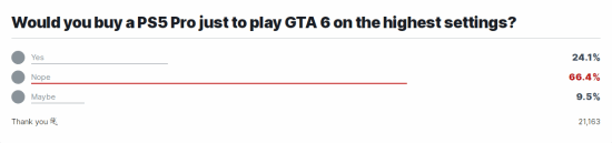 近日,IGN在官网发起了一项投票,询问玩家是否会为了在最高设置下玩《GTA6》而购买PS5 Pro。截止发稿,2.1万名投票者中有三分之二的人明确表示不会。