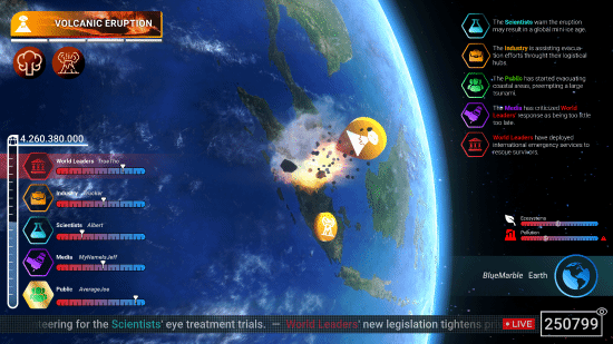 作为人类的一方,你将与最多五位挚友共同对抗地球的毁灭性打击。每个玩家将化身为不同角色,从世界领袖到普通公众,集结智慧与力量,在资源有限的情况下制定并执行各种战略。你们不仅需团结抵抗地球的攻击,还需在内部竞争中争夺生存发展机会,全面考验策略规划、执行及团队协作能力。