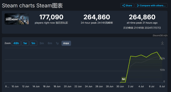 根据SteamDB的统计数据,截至撰写本文时,正在玩《第一后裔》的玩家人数为177090人。在发布后的首个周末,其峰值玩家数达到了264,860人,仅在Steam平台上就达到了这个数字。仅仅Steam平台,日均玩家就在20万左右。