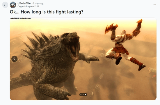 Reddit论坛上最近出现了一个热门话题,如果《战神》中的奎托斯和怪兽之王哥斯拉打一架,谁能赢?这一想法看似荒诞,但的确有大量的网友参与了讨论。