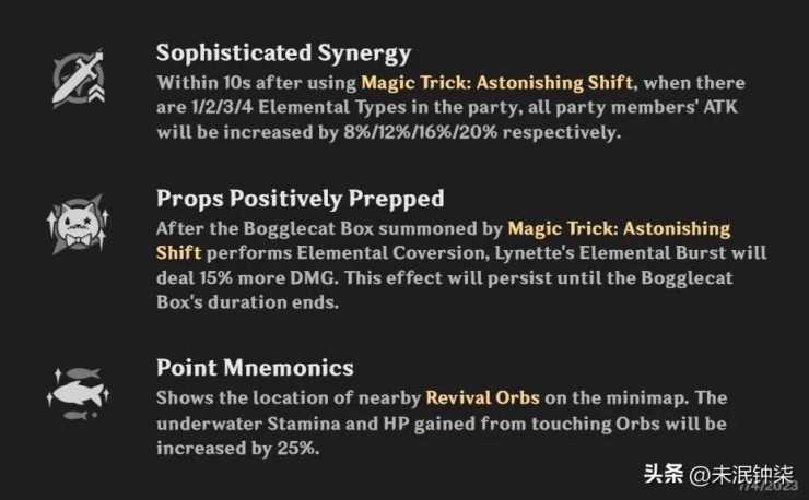 天赋1「魔术箭增强」:通过魔术箭召唤的召唤物1命中敌人时,可以回复3点元素能量,并提高造成的伤害(基于攻击力的80%)。