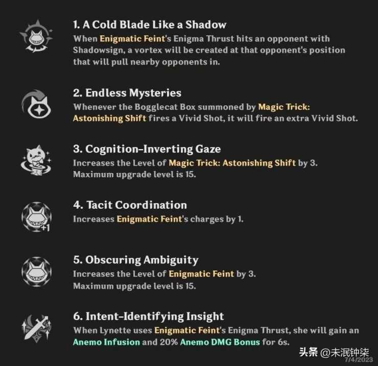 1命可以同时存在两个召唤物1,并且蓄力的魔术箭命中时直接召唤两个召唤物,并额外获得一层「效果A」;2命会使林尼在站场时每2秒增加20%的暴击伤害,最多叠加三层;3命将提升「效果A」等级;4命使得林尼的火元素重击命中敌人时,敌人的火抗降低25%,持续6秒;5命提升元素爆发技能等级;6命使得释放魔术箭时额外发射一枚「礼花弹2」,并且将造成「礼花弹1」100%的伤害,视为重击伤害。
