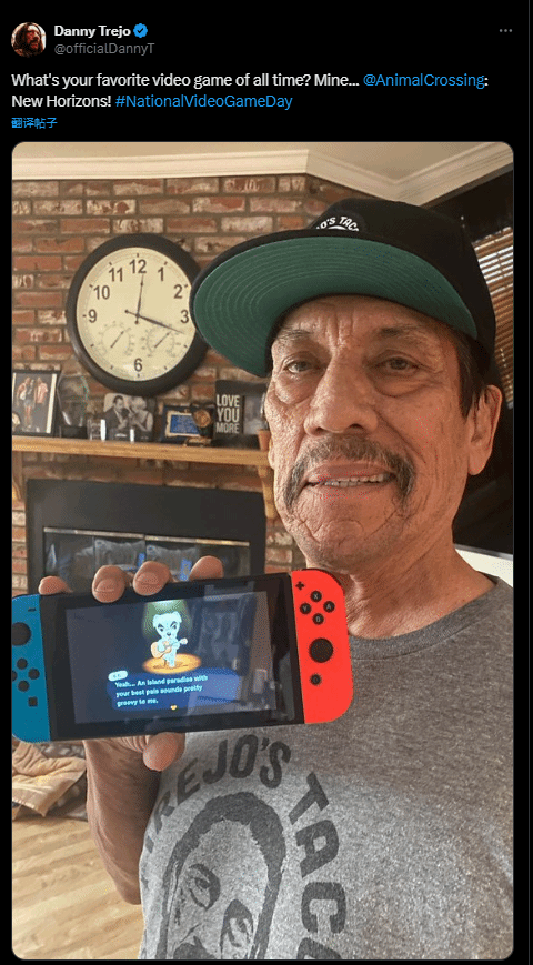 丹尼·特乔作为知名演员,曾扮演过的“弯刀”(《弯刀》)、葛雷洛·迪拉库兹(血战墓碑镇)等角色都是铁血硬汉形象。但这样一名猛男喜欢的游戏竟然是《动森》,不得不说十分有反差感,非常有趣。真就应了那句“这才是猛男该玩的游戏!”。