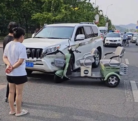 硬派越野丰田普拉多被电瓶车撞裂前杠 网友:真是开了眼