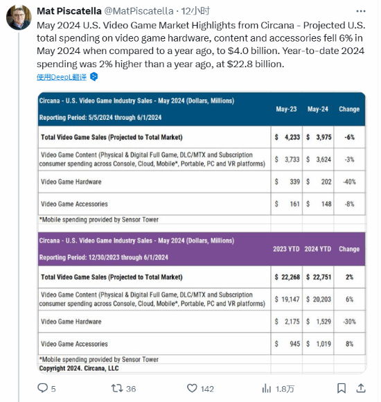 据IGN报道,近期Circana的分析师Mat Piscatella在2024年5月美国视频游戏市场的分析报告中表示,与2023年相比,视频游戏的硬件销量下降了40%。索尼、微软与任天堂的硬件销量都出现了下降,其中任天堂Switch的下降幅度最大。
