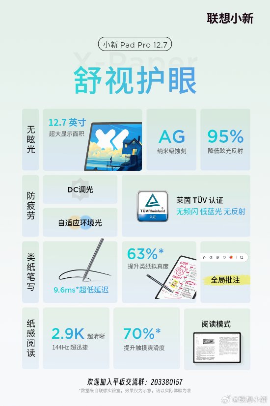 联想小新Pad Pro 12.7平板的屏幕部分采用AG纳米级蚀刻,官方表示可降低95%眩光反射,支持阅读模式;平板屏幕采用DC调光,支持自适应环境光,拥有莱茵认证;该平板手写笔书写延迟约9.6ms,支持全局批注功能。