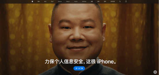 7月8日,苹果官方发布了两条有关个人信息安全的广告视频,知名相声演员岳云鹏主演。