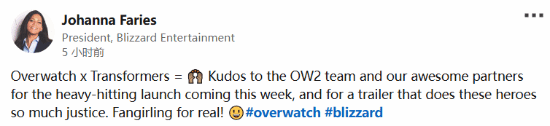 Johanna Faries表示:“《守望先锋》联动《变形金刚》,向《守望先锋2》团队和我们出色的合作伙伴致敬,感谢他们在本周推出的重磅内容以及预告片,让这些英雄得到了公正的对待,我也是迷妹一枚!”