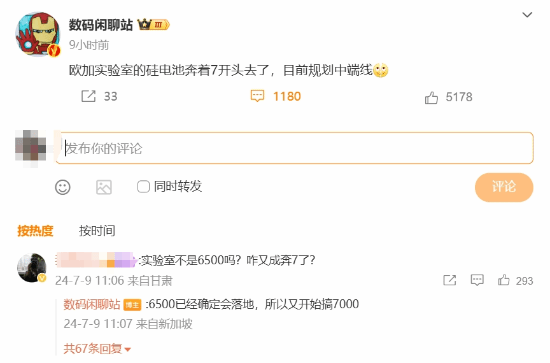 7月9日消息,博主@数码闲聊站今天透露欧加系(OPPO/一加)旗下6500毫安时电池已经确定落地,目前正在研究7000毫安时电池,计划在中端机型内应用。